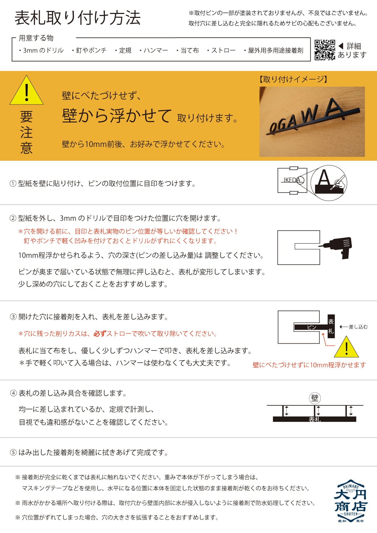 3mmのドリルで壁面に穴を4か所開け、表札裏に付いているピンを挿し込みます。