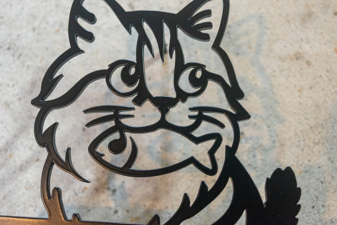 この猫表札は、お客様からいただいた猫ちゃんのお写真をもとに、耳や目、模様などを丁寧にデザインし、厚みのあるステンレス板から切り出して制作します。